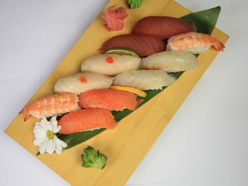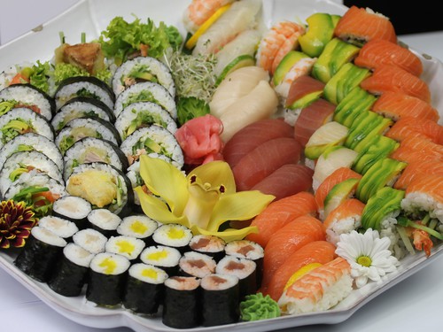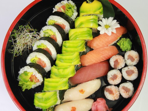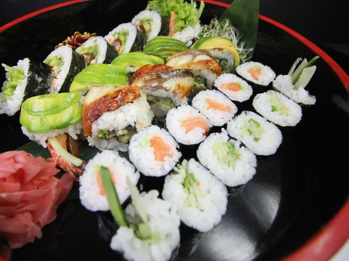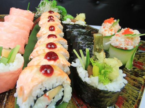 łosoś, oshinko, krewetka w tempurze, owinięte awokado z kawiorem, ogórek, sos kobe -