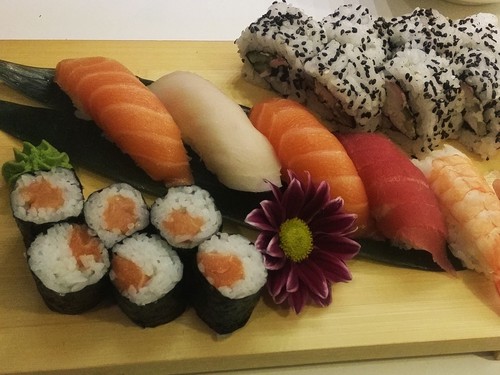 krewetki w tempurze, por, oshinko, awokado, sos kimchi, owijane opiekanym łososiem, posypane shiicimi