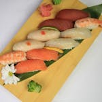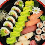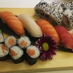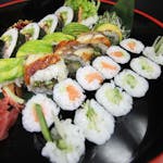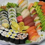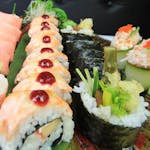 Z ŁOSOSIEM I KREWETKAMI W TEMPURZEłosoś, oshinko, krewetka w tempurze, owinięte awokado z kawiorem, ogórek, sos kobe